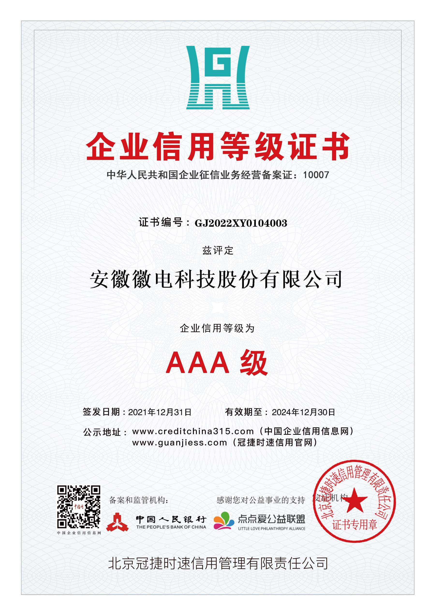 徽電科技榮獲“AAA級(jí)企業(yè)信用等級(jí)”認(rèn)證