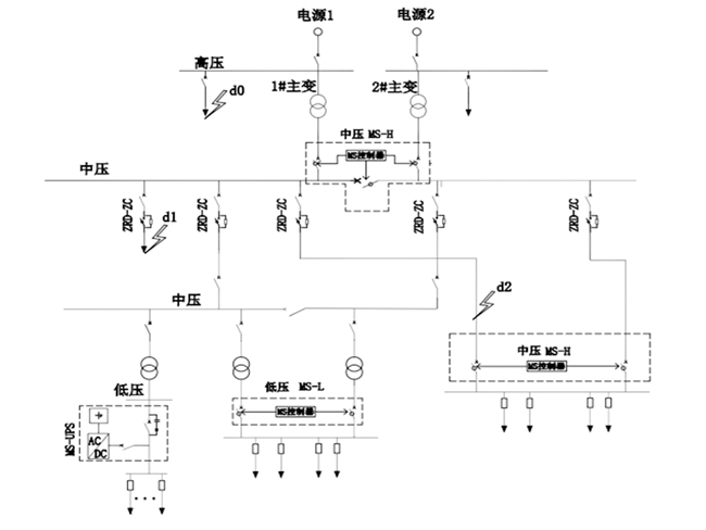 當連接高配室的支路發生短路故障(d1點或d2點),ZRD母線殘壓保持裝置,10ms內可投入高阻抗快速隔離故障線路,保障總降其他支路負荷可靠運行;若有故障的高配室內有重要負荷,ZRD保障其他負荷運行,本側高配室重可采用MS快切對重要負荷切換,同理,MS快切也可應用于低壓側重要負荷。