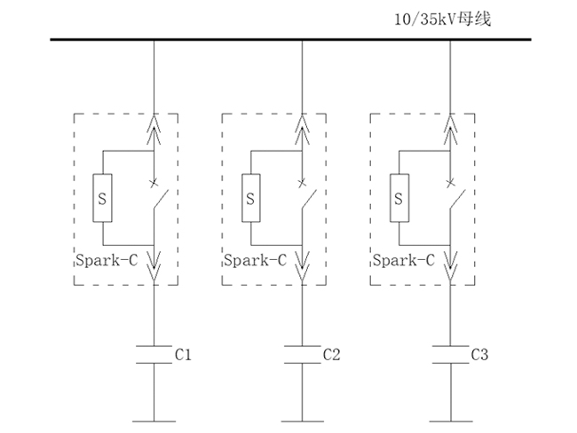 并聯補償電容器組投入時產生高達10~20倍合閘涌流,大幅縮短電容使用壽命;分閘時斷路器重燃產生高達6~7倍過電壓,嚴重影響系統運行和設備安全。10kV Spark-C相控柜提供優異的單組電容器/背靠背電容器組投切解決方案,適用于工業及電力系統的無功補償系統,如下圖。